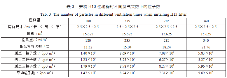 在空調機房中新建了三間2.5m×2.5m×2.5m的潔凈間,從空調主風管引風,每支支管設置調節(jié) 閥,并設排風機進行全排,送回風口及測點布置分別如圖 3(每點取樣三次,取平均值)??紤]到初中效過濾器對最后潔凈度的影響和最后理論塵埃數(shù)量 計算的方便,試驗用初中效繼續(xù)分別為G4、F8,三個房間分別安裝高效過濾器,風量500m3/h,第一組數(shù)據(jù)為送風量按GMP 驗證指南推薦換氣次數(shù)保持不變,分別用H12、H13、H14、U15過濾器,第二組數(shù)據(jù)為采用H13高效過濾器,調節(jié)風量 ;第三組數(shù)據(jù)為采用H14高效過濾器,調節(jié)風量,分別測得塵埃粒子數(shù),并列表得出不同的換氣次數(shù)下對應的塵埃數(shù)如表2、表3、表4。